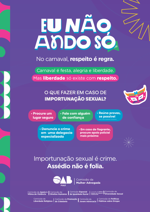 FLORIANO (PI) – Com a chegada das festividades carnavalescas de 2026, a OAB Subseção de Floriano, por meio da atuação da Comissão da Mulher Advogada (CMA), intensifica no Sul do estado a campanha “Eu Não Ando Só – 2ª Edição”. A iniciativa tem como objetivo central conscientizar a população e reforçar que a liberdade da folia não exclui o respeito: assédio não é brincadeira e importunação sexual é crime, conforme a Lei 13.718/2018.