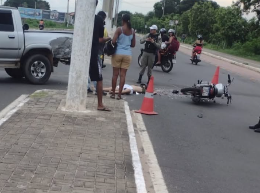 Um homem ainda não identificado morreu na tarde desta quarta-feira (04) em um trecho da Avenida Frei Antônio Curcio, em Floriano. Em imagens feitas por populares, é possível ver o corpo do rapaz estendido no chão e sua motocicleta ao lado. Ele de capacete, mas na imagem há uma grande poça de sangue. Ao lado, uma caminhonete está com a parte da carroceria com um forte amassado, como se fosse uma pancada violenta. As circunstâncias do acidente ainda serão investigadas. Matéria em atualização!