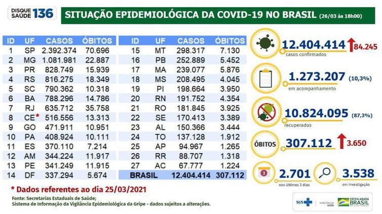 Os dados estão na atualização do Ministério da Saúde divulgada na noite desta sexta-feira (26). O balanço é produzido com as informações coletadas pelas autoridades estaduais e locais de saúde.