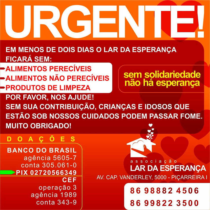 O Lar da Esperança fica localizado na Avenida Capitão Vanderley, 5000, Piçarreira I. Os telefones de contato são 86 98882-4506 e 86 99822 -3500.