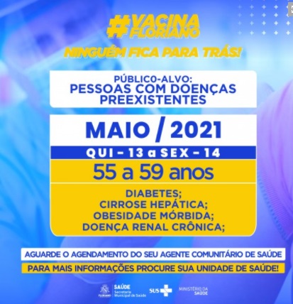 A Secretaria de Saúde de Floriano realiza nesta quinta (13) e sexta-feira (14), a vacinação de pessoas com comorbidades, ou seja, doenças preexistentes que podem agravar a situação clínica de pacientes acometidos pela Covid-19 que tenham Diabetes, cirrose hepática, obesidade mórbida e doença renal crônica entre 55 e 59 anos.