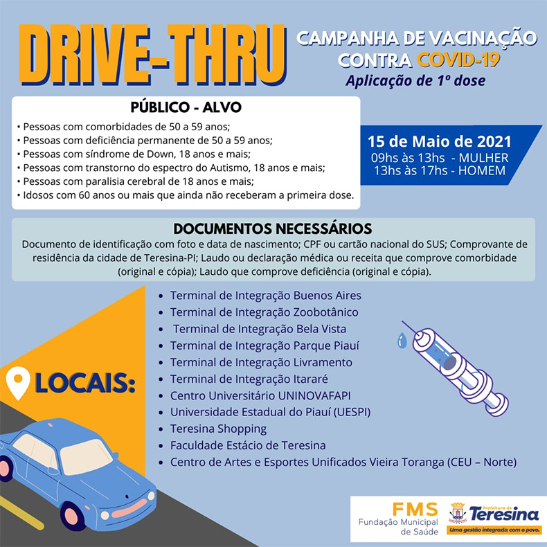 No próximo sábado (15), a Fundação Municipal de Saúde (FMS) abrirá 11 pontos de drive-thru para vacinação contra a covid-19. Desta vez, serão contemplados as pessoas com comorbidade de 50 a 54 anos e pessoas com deficiência permanente, entre 50 e 54 anos de idade, além de outros públicos já contemplados em etapas anteriores da campanha.