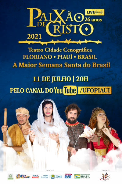 A Paixão de Cristo 2021, de Floriano-PI, considerada um dos maiores espetáculos religiosos do País será realizada no dia 11 de julho, às 20h, ao vivo pelo YouTube, no canal UFOPIAUI. No local de encenação estarão presentes apenas atores e equipe técnica – respeitando todos os protocolos de segurança exigidos, devido à Covid-19. E contará com a participação de Danilo Sacramento, grande nome da dramaturgia brasileira, que dará vida a Pôncio Pilatos.