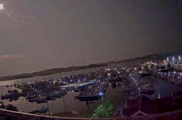 Uma câmera em Holmestrand, ao sul de Oslo, capturou uma bola de fogo caindo do céu e explodindo em um flash brilhante iluminando uma marina.