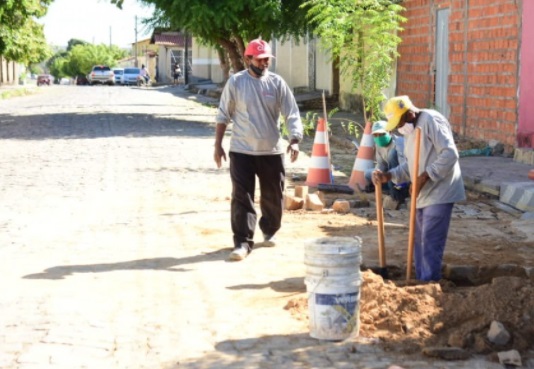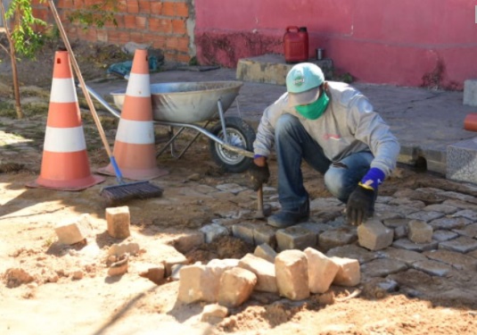 As ações de recuperação de vias urbanas também chegaram em mais trechos de maior extensão, com a recuperação da rua Antonino Freire com a rua Emídio Rocha, equivalente a 135 m² de calçamento recuperados, contemplando a extensão da Passagem Molhada, no bairro Manguinha.
