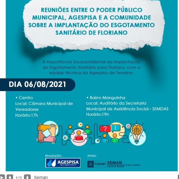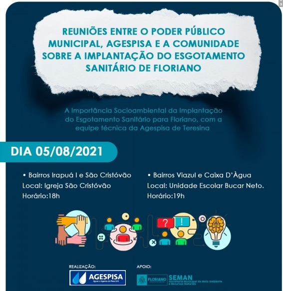 O Poder Público Municipal, através da Secretaria de Meio Ambiente e Recursos Naturais, e a Agespisa estarão realizando reuniões nesta quinta (5) e sexta (6) com o objetivo de esclarecer e informar sobre o sistema de esgotamento sanitário que funcionará, em breve, em seis bairros contemplados nesta primeira etapa.