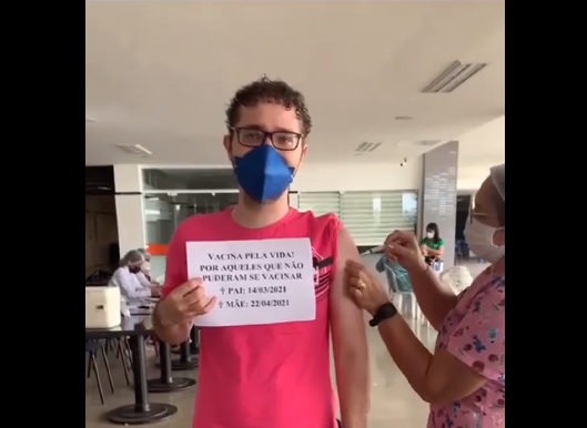 Deusuilson Filho, de 23 anos, emocionou internautas ao levar um cartaz no momento de receber a tão esperada vacina contra Covid-19. No texto, ele lembra dos pais que morreram vítimas da doença: vacina pela vida! Por aqueles que não puderam se vacinar.