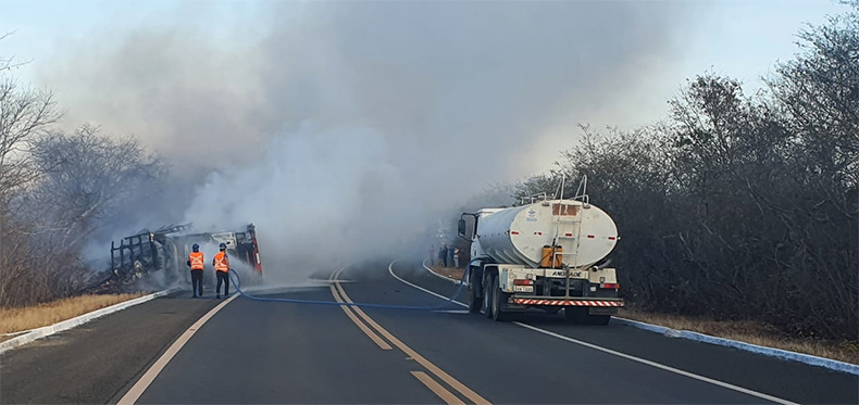 Para apagar as chamas foi necessário um caminhão-pipa. O serviço de guincho foi acionado para a remoção dos destroços do caminhão.