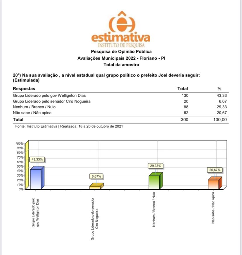 Pesquisa realizada pelo Instituto Estimativa em Floriano, entre os dias 13 e 20 de outubro, em universo de 300 pessoas entrevistadas, mostra que 43,33% da população da Princesa do Sul quer o prefeito Joel Rodrigues (PP) ao lado do governador Wellington Dias (PT) nas eleições de 2022. De acordo com o levantamento, apenas 6,67% concordam com a decisão de o prefeito seguir Ciro Nogueira e o presidente Jair Bolsonaro. Outros 29,33% responderam que Joel não deve seguir nenhum deles e 20,67 não sabem ou não quiseram opinar.