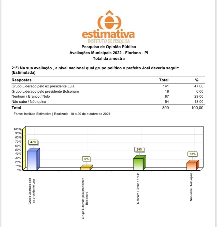 O prefeito Joel Rodrigues já confirmou sua pretensão de lançar sua pré-candidatura a senador nas eleições do ano que vem, com apoio de Ciro Nogueira, atual ministro-chefe da Casa Civil de Bolsonaro. A pesquisa também mostra que, para 47% dos entrevistados, Joel Rodrigues deveria votar e apoiar Lula em 2022, contra apenas 6% que preferem o prefeito pedindo votos para Bolsonaro. Vinte e nove por cento responderam nenhum e 18% disseram que não sabem.