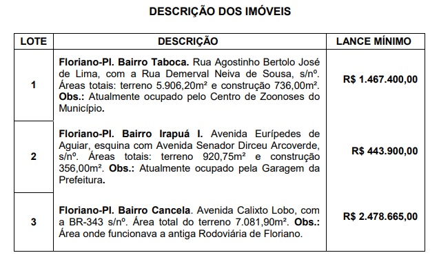 Nesta sexta (29), está previsto para acontecer em Floriano, o leilão online, do tipo Maior Lance, dos imóveis como garagem da prefeitura, centro de zoonoses e antigo terminal rodoviário, onde serão aceitos lances via Internet, com participação on-line dos interessados, por meio de acesso identificado e fornecido sob exclusiva responsabilidade do leiloeiro, através do site: www.leilaovip.com.br. Com o dinheiro levantado no leilão, cerca de 4 milhões e 300 mil, a Prefeitura de Floriano prevê investimentos em pelo menos uma grande reforma no Mercado Central transformando o local em ponto turístico e a construção de dois centros comerciais, onde um deles irá abrigar feirantes e ambulantes.