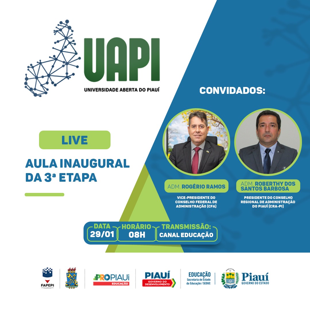 Mais de três mil alunos participarão da aula inaugural da 3ª etapa da Universidade Aberta do Piauí, neste sábado (29), através da transmissão ao vivo do Canal Educação (Youtube).
