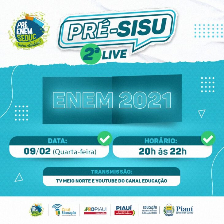Para auxiliar os estudantes em uma escolha acertiva na inscrição no Sistema de Seleção Unificada (Sisu), a Secretaria de Estado da Educação (Seduc), através do Canal Educação, realiza nesta quarta-feira (09) a segunda live Pré-Sisu. No dia 11 de fevereiro, os estudantes terão acesso aos resultados do Exame Nacional do Ensino Médio (Enem) 2021, e de 15 a 18 de fevereiro acontecerão as inscrições do Sisu.