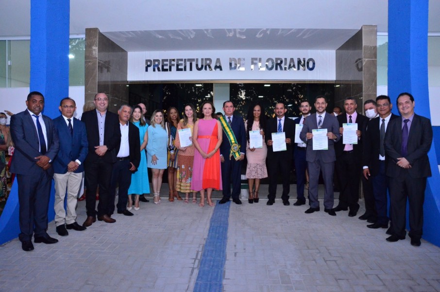 O prefeito de Floriano, Antônio Reis Neto, ladeado da primeira-dama, Carmélia Reis, do ex-prefeito, Joel Rodrigues, vereadores, secretários e equipe, deu posse aos novos secretários municipais, em solenidade realizada na sede da Prefeitura de Floriano, na tarde desta segunda (4).