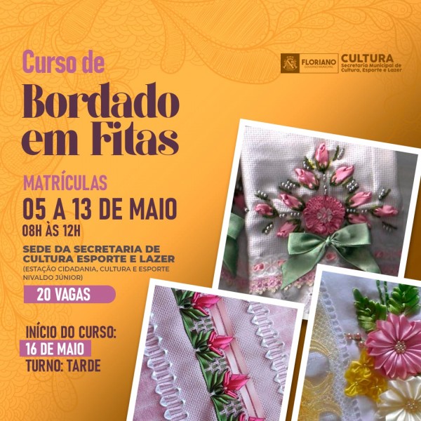 A Prefeitura de Floriano, por meio da Secretaria de Cultura, Esporte e Lazer, abriu inscrições para um curso de bordado em fitas, voltado à comunidade, que oferta 20 vagas.