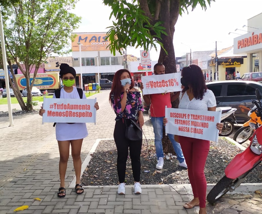 Manifestantes com faixas e cartazes protestaram na manhã desta segunda-feira, 14, em frente a Câmara Municipal de Floriano. Eles pedem o veto do projeto de Lei Complementar nº 001/2020 referente a contribuição para o custeio da iluminação pública e concede isenção para mais de duas mil famílias.