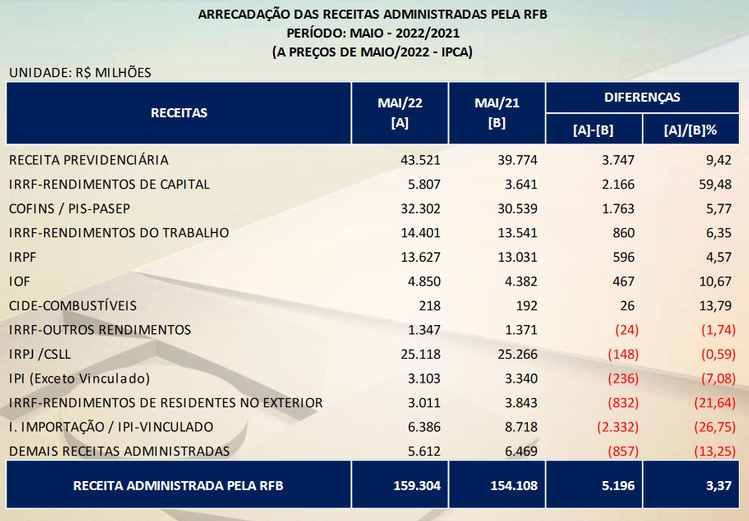 Em termos absolutos, contudo, a arrecadação com receitas previdenciárias movimentou a maior cifra: R$ 43,52 bilhões (acréscimo de 9,42% em comparação a maio de 2021). Em seguida vêm as receitas obtidas com a cobrança do Cofins/Pis-Pasep (R$ 32,30 bilhões) e IRPJ/CSLL (25,11 bilhões).
