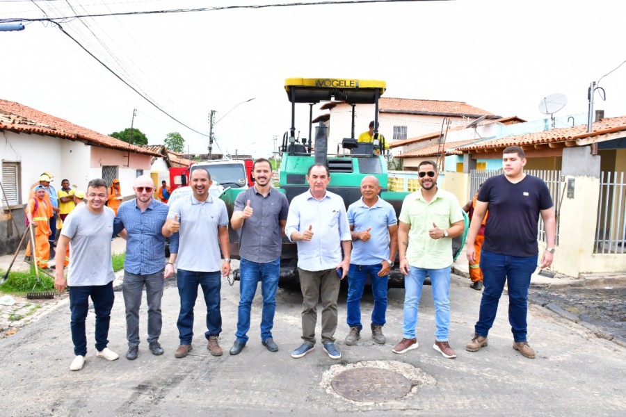 O prefeito de Floriano, Antônio Reis, na companhia dos secretários: de infraestrutura, Júlio César Ferreira; de Governo, Marcony Alisson; e, do Procurador do Município, Phillipe Cronemberger, visitou a obra de implantação de pavimentação asfáltica que está sendo executada em Floriano, que neste sábado (17), chegou à Rua José Araújo Costa, no bairro Sambaíba Nova.