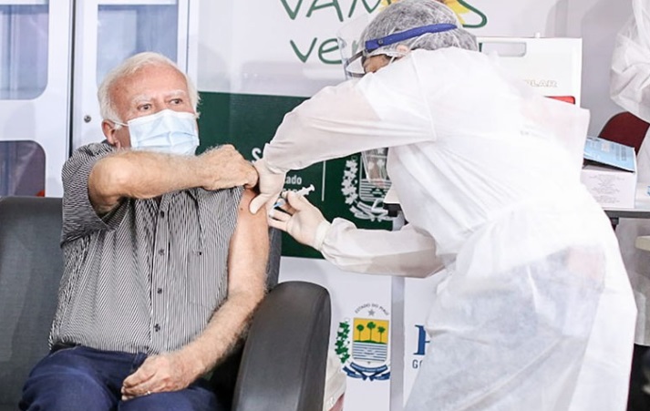 O obstetra Joaquim Vaz Parente, de 75 anos, que atua há 45 anos na da Maternidade Dona Evangelina Rosa (MDER), foi o primeiro profissional de saúde a receber a primeira dose da coronavac no Piauí. A solenidade de lançamento da campanha de vacinação aconteceu no pátio da Secretaria de Saúde do Piauí.