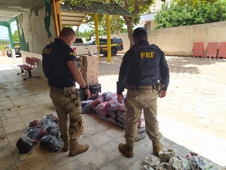 A Polícia Rodoviária Federal (PRF) apreendeu um carregamento de materiais esportivos que eram transportados sem nota fiscal pela BR-135, na altura da cidade de Cristino Castro, no interior do Piauí. No total foram apreendidos mais de 300 produtos entre bolas, bonés, calçados, entre outros, que eram levados em uma camionete.