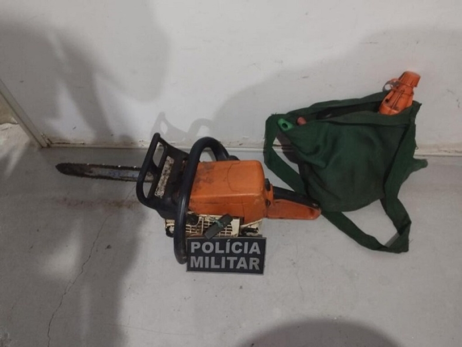 Diante dos fatos, uma guarnição foi acionada e se deslocou até o local, onde o agressor foi encontrado sentado. Após uma abordagem padrão, a motosserra foi localizada ao lado da residência.