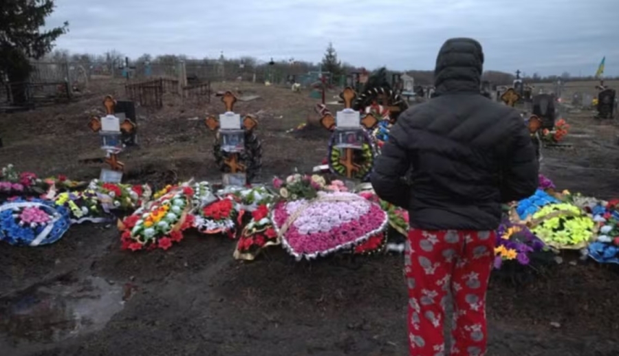 Agora, em um cemitério nos arredores de seu vilarejo, Dima observa as coroas de flores em cores vivas cobrirem os túmulos recém cavados de seus pais e avós paternos. Eles ainda não têm lápides, mas têm cruzes de madeira com fotos suas sorrindo.