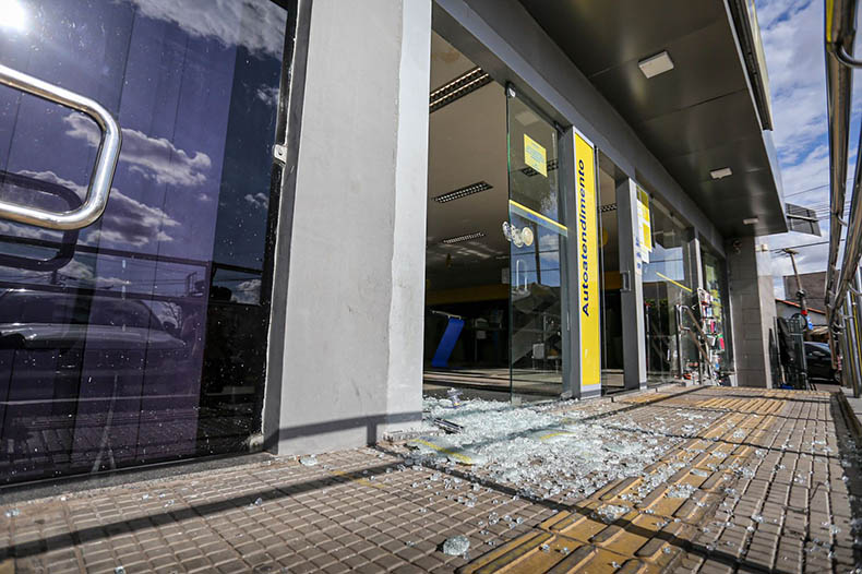 Além do homem que abordou a funcionária da empresa, havia um outro criminoso dando apoio à ação. As marcas dos tiros trocados entre os criminosos e o segurança da empresa, ficaram na grade que circunda o estacionamento. A porta do banco que foi atingida por um disparo e quebrou ainda não foi recolocada.