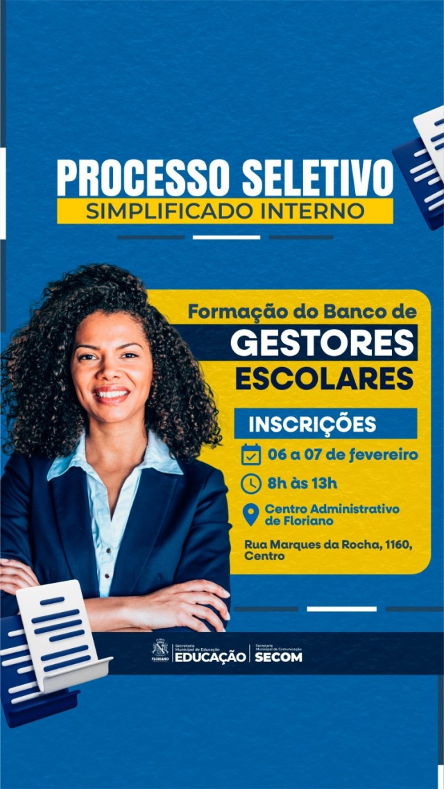 A Prefeitura Municipal de Floriano, por meio da Secretaria Municipal de Educação, prevê para o dia 14 de fevereiro, a divulgação do resultado do processo de seleção simplificada interna para a formação do Banco de Gestores Escolares das escolas da rede pública municipal, voltado exclusivamente para professores do quadro efetivo da rede.