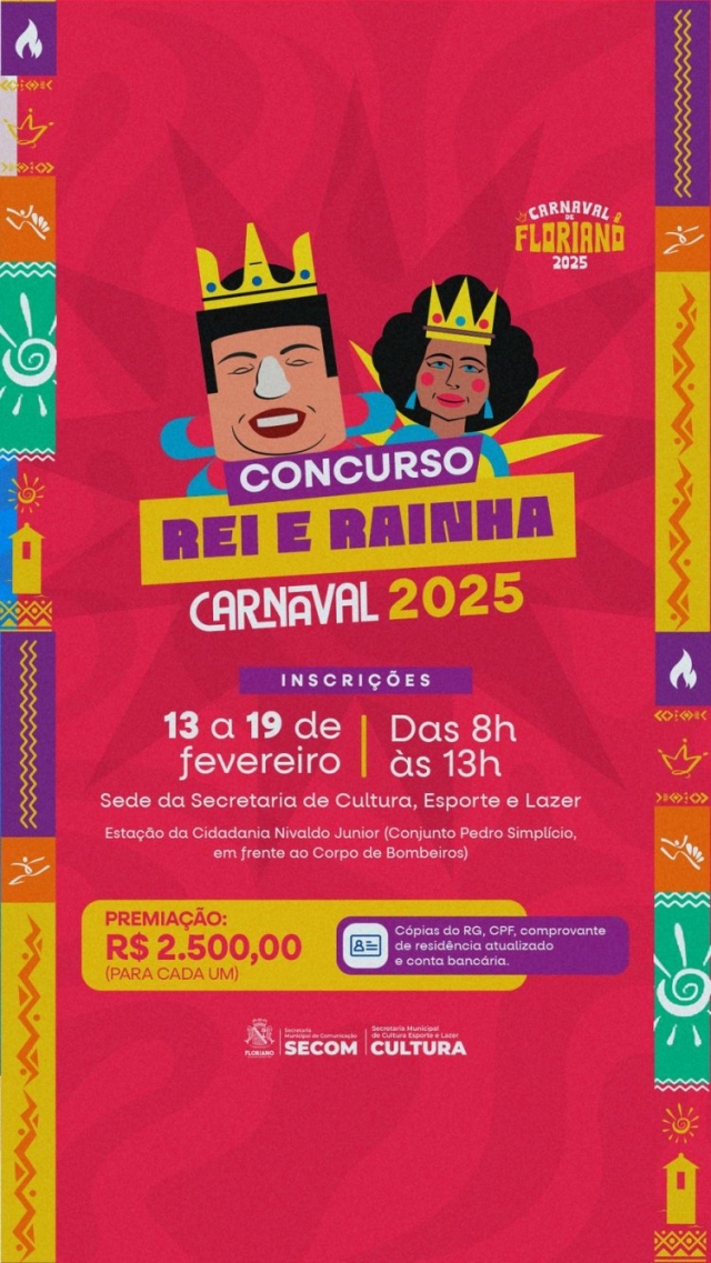 A Prefeitura de Floriano, por meio da Secretaria Municipal de Cultura, Esporte e Lazer, anunciou a abertura das inscrições para o concurso que irá eleger o Rei e a Rainha do Carnaval 2025. As personalidades escolhidas representarão a cidade nas festividades de Momo, com destaque para a tradição e a alegria do carnaval da Princesa do Sul.