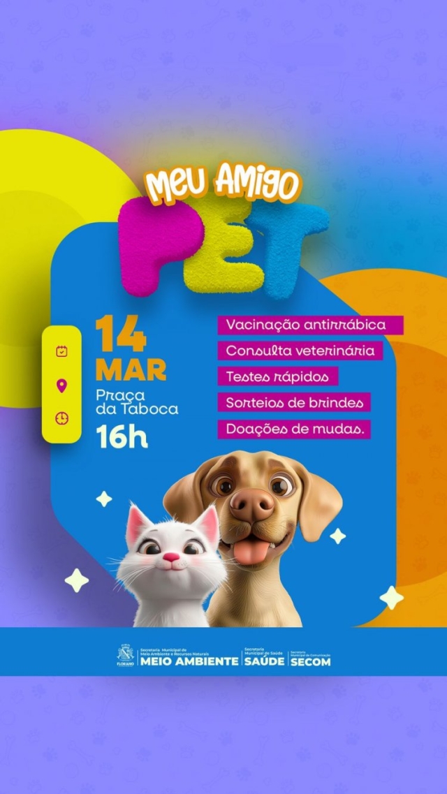 A Prefeitura de Floriano, por meio da Secretaria Municipal de Saúde e em parceria com a Secretaria Municipal de Meio Ambiente e Recursos Naturais, realizará mais uma edição da campanha ‘Meu Amigo Pet’ nesta sexta-feira, 14 de março. A ação, voltada para o bem-estar animal e orientacões sobre cuidados com o amigo de quatro patas, ocorrerá na Praça do bairro Taboca, a partir das 16h.