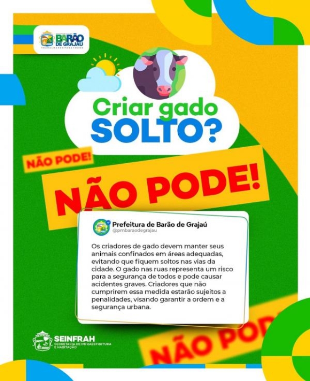 A Prefeitura Municipal de Barão de Grajaú emitiu um comunicado nesta sexta-feira (10), orientando os criadores de gado a manterem seus animais confinados em áreas apropriadas, evitando que fiquem soltos pelas vias da cidade. A iniciativa busca garantir a segurança dos munícipes e preservar a ordem urbana.