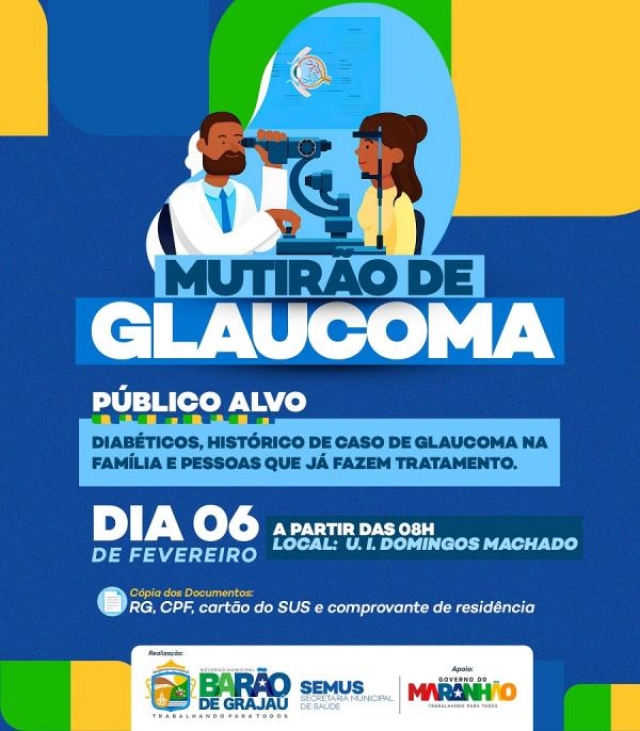 A Prefeitura de Barão de Grajaú, por meio da Secretaria Municipal de Saúde, realizará um mutirão de glaucoma no dia 06 de fevereiro, a partir das 08h, na Unidade Integrada Domingos Machado.
