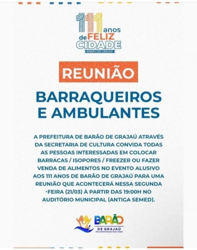 A Prefeitura Municipal de Barão de Grajaú, está convocando todos os barraqueiros e vendedores ambulantes, para uma reunião que será realizada nesta segunda-feira (21), para tratar de assuntos relacionados às comemorações do aniversário do município.