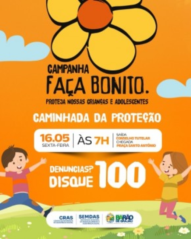 Na próxima sexta-feira, 16 de maio, o município de Barão de Grajaú promoverá a Caminhada da Proteção, em alusão à campanha nacional “Faça Bonito – Proteja nossas crianças e adolescentes”. A mobilização tem como objetivo reforçar o compromisso da sociedade no enfrentamento à violência contra crianças e adolescentes.