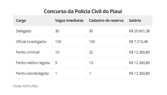 Ao todo, são 200 vagas imediatas: 30 para delegado, 150 para investigador e 20 para perito criminal. Também há 216 vagas para cadastro de reserva. Os salários variam de R$ 7,2 mil a R$ 20,6 mil.