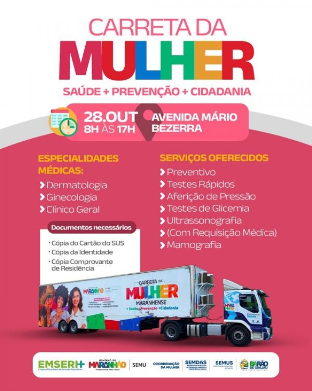 Saúde, prevenção e cidadania vão estar em destaque em Barão de Grajaú no próximo dia 28 de outubro, quando a cidade receberá a Carreta da Mulher Maranhense, uma grande ação em parceria com o Governo do Maranhão voltada à promoção da saúde feminina.