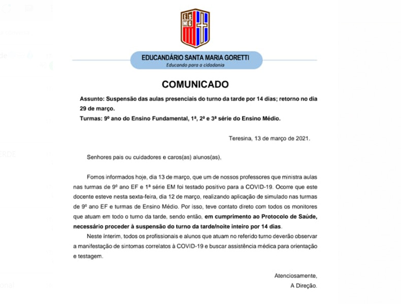As aulas para os alunos do 9º ano do Ensino Fundamental e dos 1º, 2º e 3º anos do Ensino Médio do turno da tarde, no Educandário Santa Maria Goretti, no Centro de Teresina, foram suspensas por 14 dias, após um dos professores testar positivo para Covid-19.