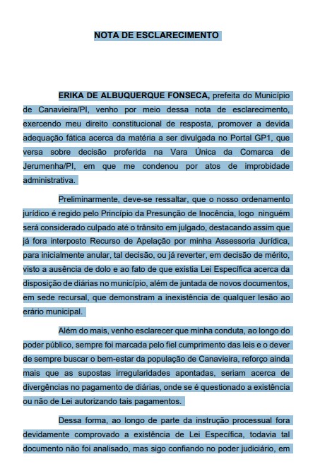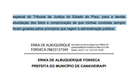 A juíza Lucyane Martins Brito, da Comarca de Jerumenha, condenou a prefeita de Canavieira, Érika de Albuquerque Fonsêca, por participação em esquema de diárias ilegais entre 2017 e 2018, quando era secretária de Assistência Social. Também foram condenados o ex-prefeito Joan de Albuquerque Rocha e outros três ex-gestores.