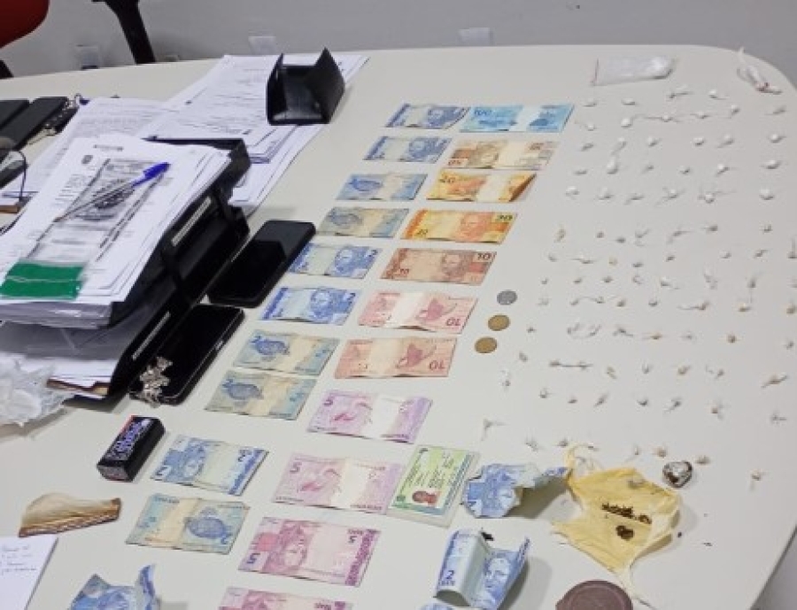 Na madrugada dessa sexta-feira (28), por volta das 02h, a viatura do policiamento convencional, visualizou dois indivíduos em atitude suspeita, ao ser realizado a busca pessoal, foi encontrado com o suspeito a quantia de R$ 269,00, 64 invólucros de substância análoga a crack, 29 invólucros de substancia análoga a cocaína, 5g de substancia análoga a maconha e 11g de substancia análoga a cocaína, além de 2 aparelhos celulares.