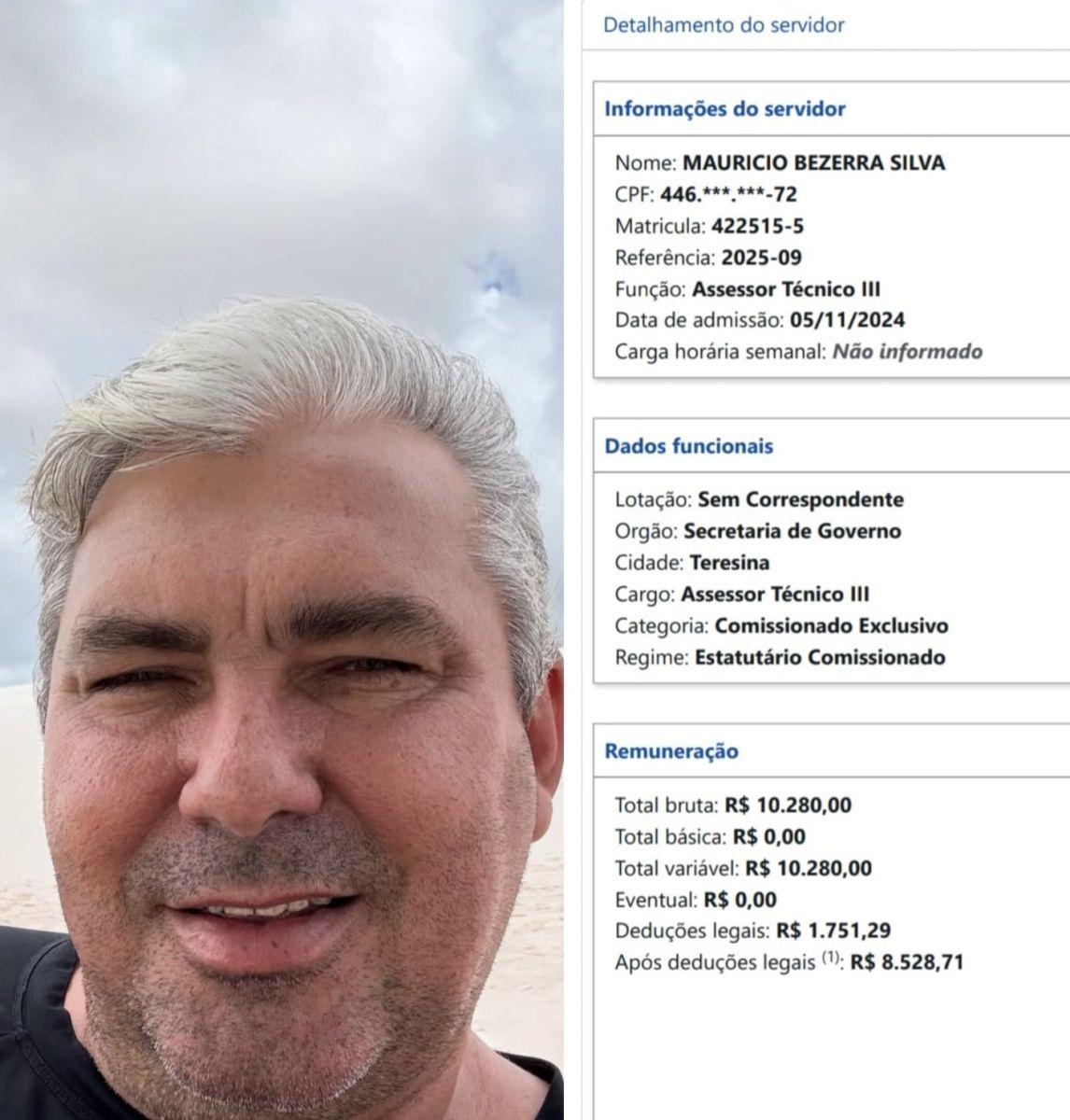 Segundo dados do Portal da Transparência do Governo do Estado do Piauí, Maurício Bezerra foi nomeado em 5 de novembro de 2024 para o cargo de Assessor Técnico III, com remuneração de R$ 10.280. No sistema, o campo de lotação aparece como "Sem Correspondente”, sem indicação de setor ou função.